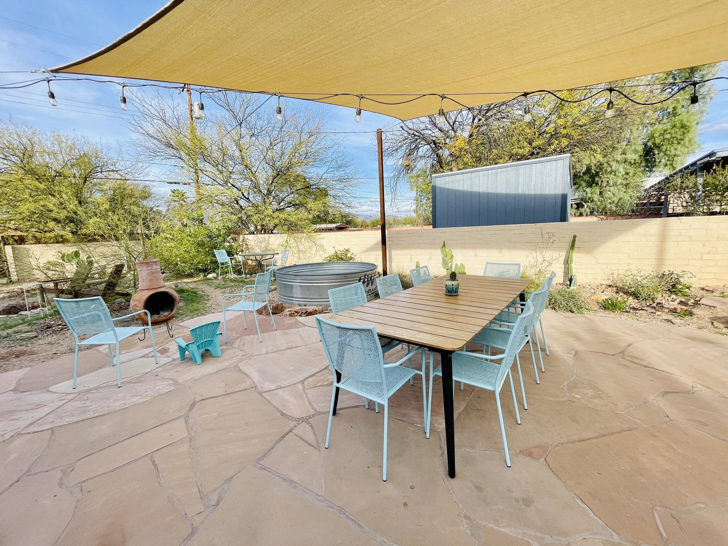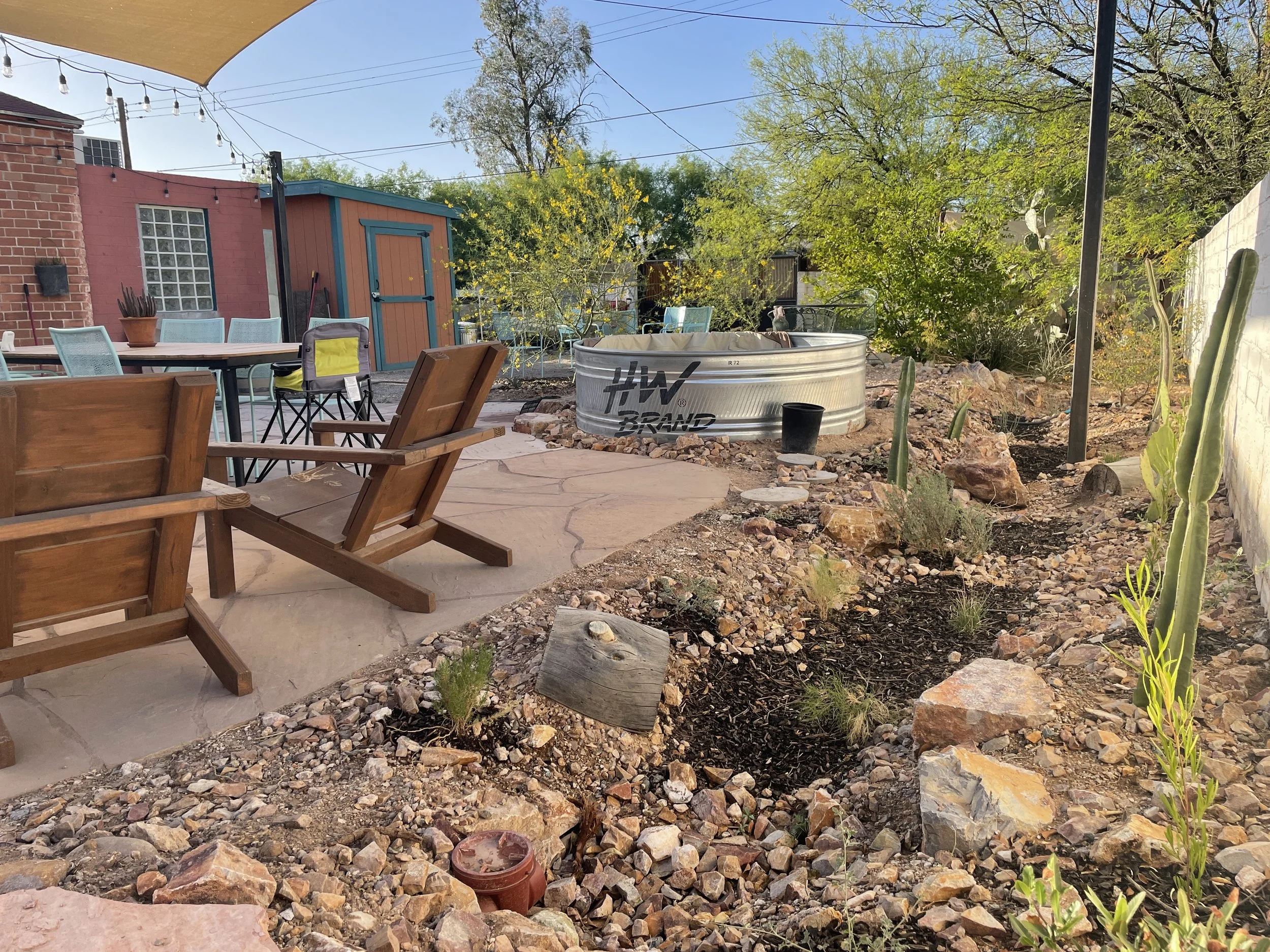 Alex’s design for the backyard extended the flagstone to enhance connectivity to the main residence. New features also included turf, a stock tank pool, and a shade sail secured with metal posts. Gutters were installed on the main residence which drain into a long vegetated swale via a subterranean pipe. Various sized boulders transition the turf patch into a sandbox, giving the residents’ kids a space for natural play. Glow-in-the-dark aggregate details the flagstone grout.